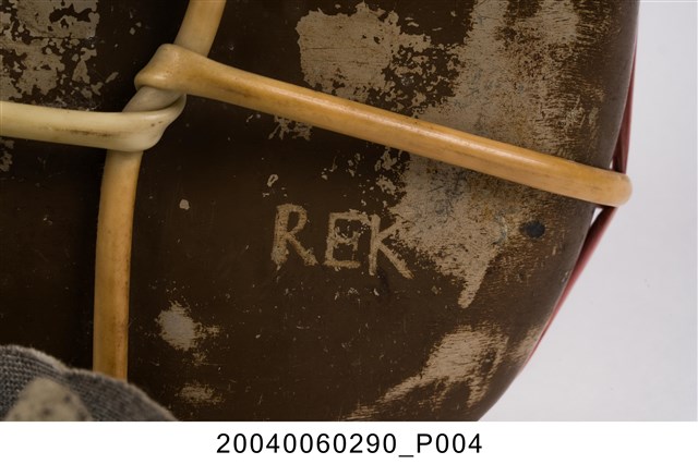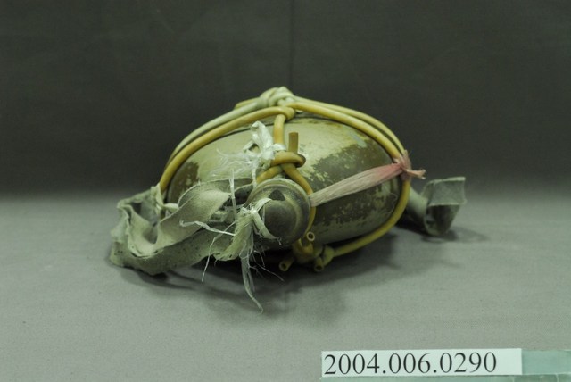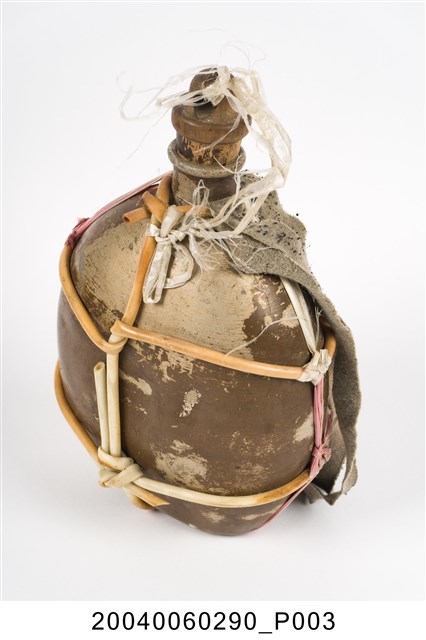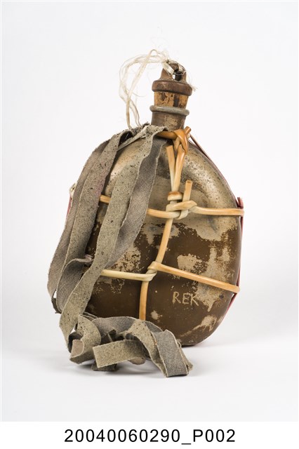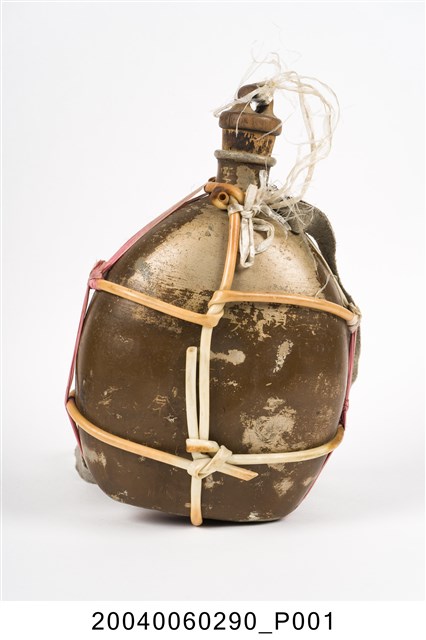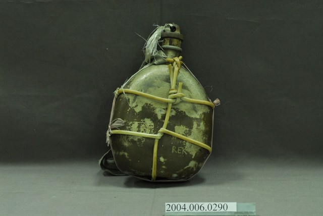1. 鋁製日軍九四型水壺,以鋁金屬製成,外觀呈銀灰色和氧化生鏽的斑紋,口小腹大,壺身大致呈扁橢圓形,右下方刻有「REK」三個英文字母,可能為此水壺原使用者的名字。壺身以細塑膠管和尼龍繩綑綁,纏繞於頸部的塑膠管上繫有細長布條作為背帶。壺口塞有壺塞,以鐵金屬和軟木製成,外形呈上寬下窄的圓柱狀,上方有一圓環,綁上尼龍繩與壺身相接,軟木塞的直徑略小於水壺壺口,使其塞入時利用軟木塞具彈性的特性增加密封性,防止內部液體滲出。2. 日軍九四式水壺容量為1公升,定型於昭和九年(1934年),是二戰時期日軍使用最廣泛的水壺形制,一直使用至戰爭結束。本件為較為簡陋的九四型水壺。