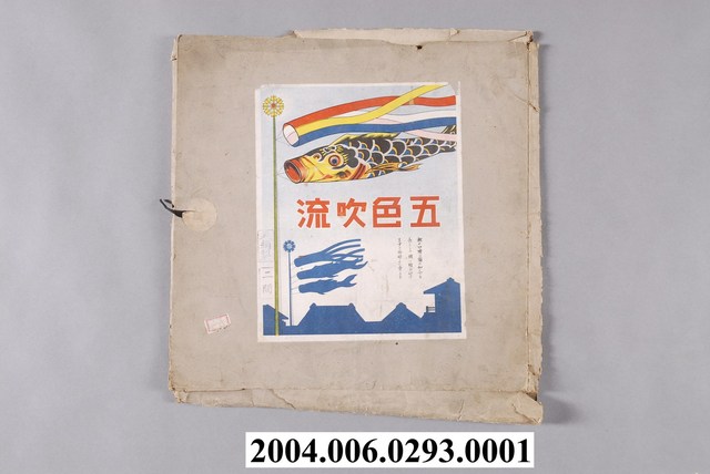 本件為包裝盒,五色吹流的鯉魚旗收納於方形紙盒內,盒正面貼商品標示圖,書寫商品名為「五色吹流」,五色吹流一般放在鯉魚旗旗杆的頂端。鯉魚旗是日本陽曆5月5日,有男孩的家庭在庭院前掛上鯉魚旗,具有祈求健康平安長大的意義,常見顏色有黑、紅、藍、綠、粉紅。
