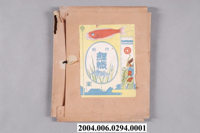 本件為包裝盒,鯉魚旗收納於方形紙盒內,盒正面貼商品標示圖,書寫商品名為「特製鯉幟」。鯉魚旗是日本陽曆5月5日,有男孩的家庭在庭院前掛上鯉魚旗,具有祈求健康平安長大的意義,常見顏色有黑、紅、藍、綠、粉紅。