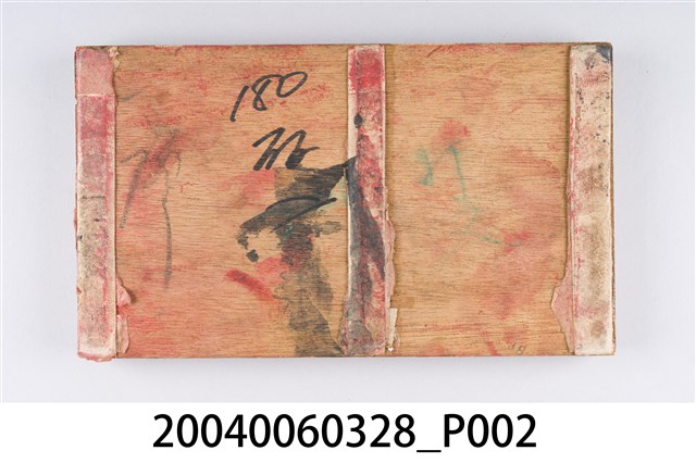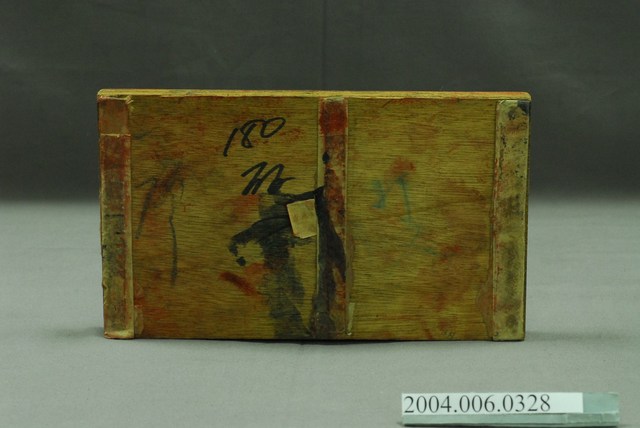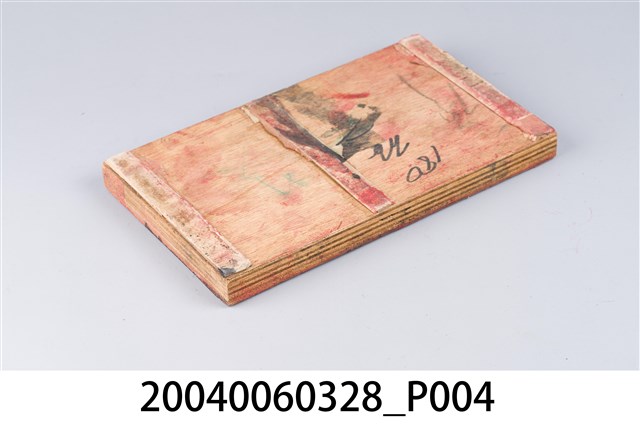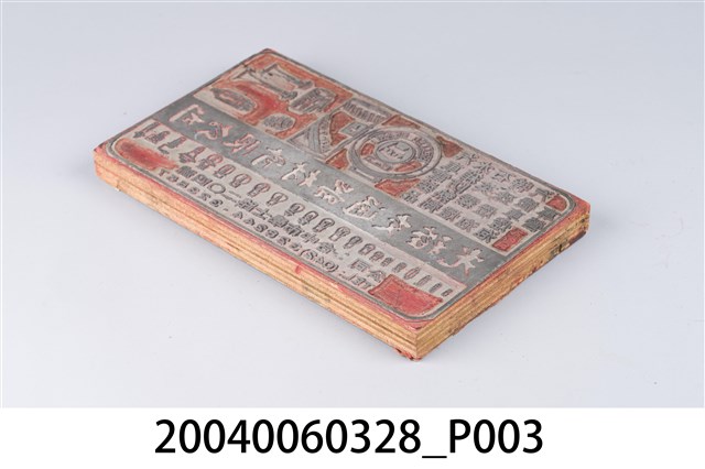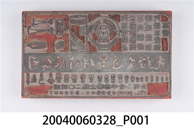 1.本物件為光裕交通器材有限公司版印,材質為木質,形狀呈長方形,中央刻有「光裕交通器材有限公司」;左上方刻有「專營汽機車燈泡、特殊燈泡、石英霧燈、水箱防熱劑、汽車電裝品」;下方刻有公司地址與電話;其餘地方刻有此公司販賣物之圖案。