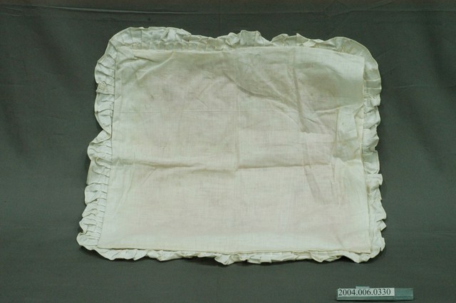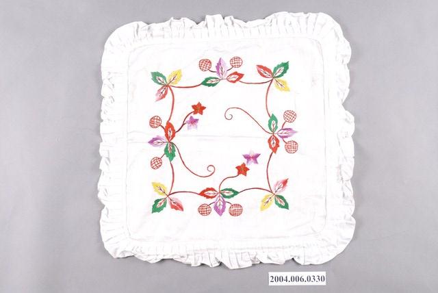 1.花卉紋方型抱枕套,長50.7cm、寬50.3cm、高1.8cm,抱枕套為白底方型,四邊加縫白色荷葉邊裝飾,枕面以緞面繡繡有圍繞抱枕方型的五彩纏枝花卉紋,以套針技法細膩呈現花葉的色彩變化。抱枕背面側邊有開口,可放入枕芯。此件抱枕套背面有些微泛黃痕跡,荷葉邊有部分脫線。2. 館藏登錄號2004.006.0330至館藏登錄號2004.006.0333的四件方型抱枕套在布料、紋樣、畫面安排上均十分相似,應為同時生產的產品。