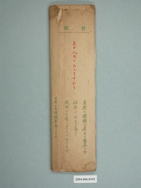 1.本件錦牌和室紙,以紙捲摺疊包裹成,長7.9公分,寬28.1公分,高1.1公分的長方形商品,外層另以商品包裝紙包裹。包裝紙正面以紅色為底,中央圓形開光內作和室門窗圖樣,周圍帶有不規則綠色塊裝飾,右下側有櫻花圖樣。底部以圓形花卉裝飾。畫面上端橫書「特撰品」,中段直書紅色「ニシキ系入」、綠色「障子紙」字樣。背面則印刷有商品說明文字,紙內添加線材,自然形成優美圖案,且黏貼容易,耐用性高,各式需求與尺寸皆可製作。2.障子紙主要用來黏貼於日本建築中的格柵門窗,其紙特性較為堅韌不易破損,兼具透光性與透氣性。