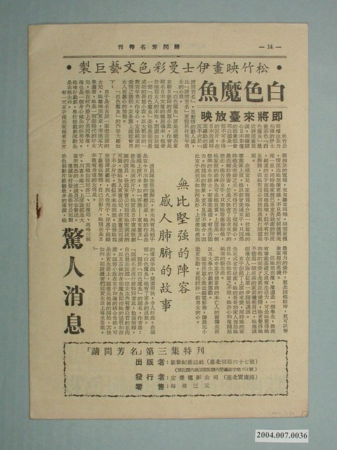 日本片《請問芳名第三集》的電影特刊,由宏豐電影公司發行、新世紀雜誌社出版,印刷裝訂成冊,每冊三元。封面為該片男女主角佐田啓二及岸惠子兩人相擁的劇照,搭配「岸惠子主演」、「日本影界有史以來最高賣座冠軍片」、「松竹創業三十五年哀艷纏綿最成功文藝代表作」等文案字樣。