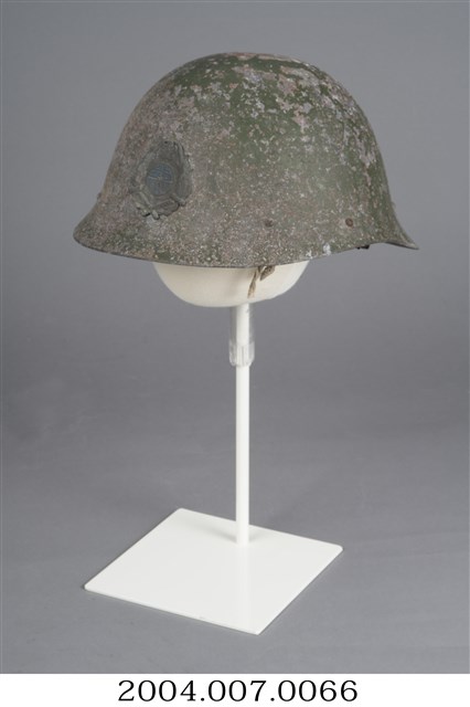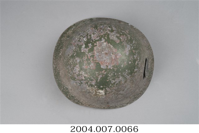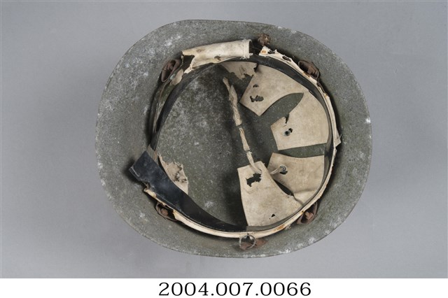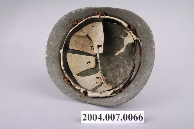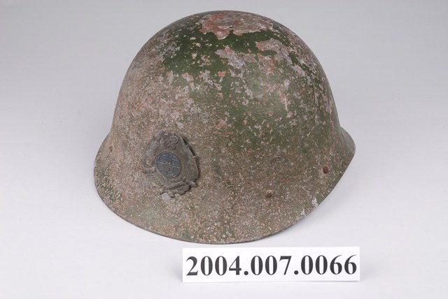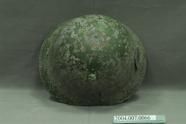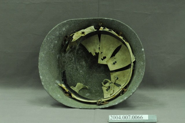 1.此鋼盔能一定程度防止來自上方的子彈、破片攻擊,不過對於頭部側面、後頸的防護較差。此頭盔裝有金屬梅花帽徽,全帽有明顯生鏽情形,可分離的內盔外部大致與外盔相合,支撐懸帶已有嚴重破損污漬,連接外盔與內盔的固定帶破損、顎帶已脫落。