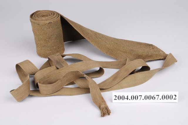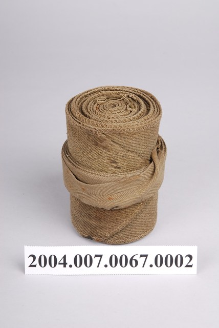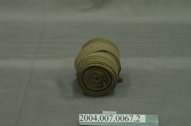 此一綁腿是以草綠色麻布料製成,寬度約9.1公分,兩邊以鎖邊機(拷克機)鎖邊處理,目的是防止布料毛邊,綁腿的末端以縫紉機車縫成三角形,最尾端再連接棉繩做為綁帶,棉繩接縫處車縫呈方形與十字交叉以增加堅牢度。草綠色是軍服的顏色,但在1930年代適逢第二次世界大戰開始,日本政府為了顧及學生安全,規定制服布料顏色改為「國防色」(草綠色)。中等學校男學生上軍訓課時,腳上還必須要打綁腿,職業學校學生也一樣。所以綁腿有可能是軍用的物品,也有可能是中學男生軍訓課的制服物件。