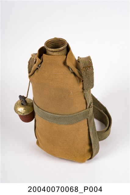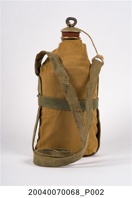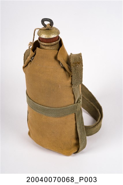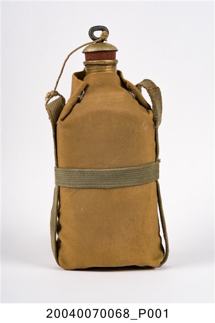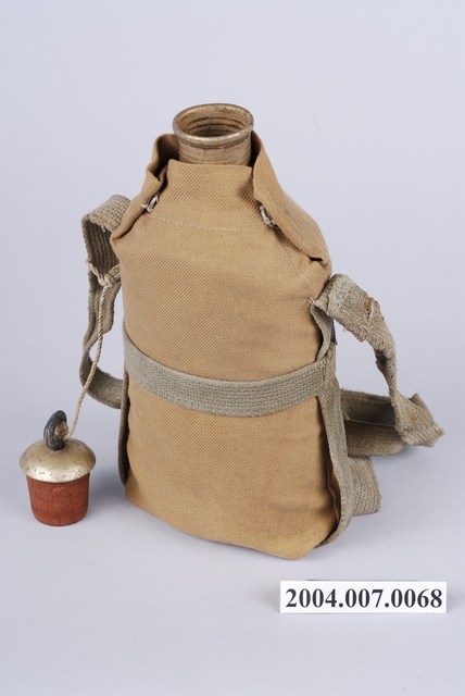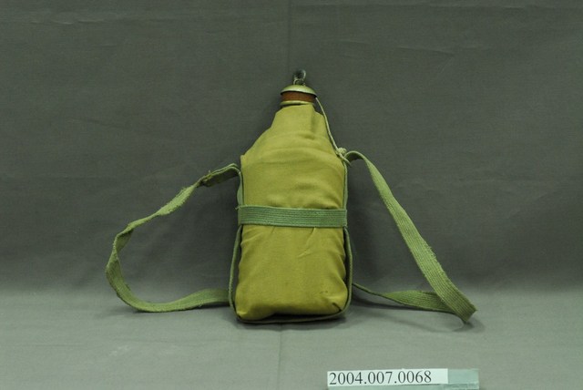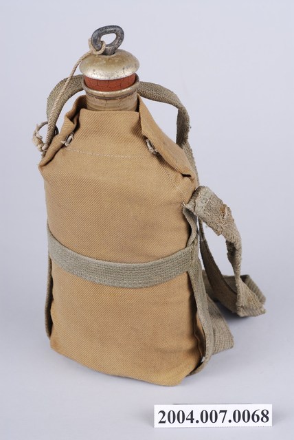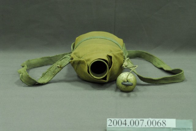 1. 鋁製日軍明治型水壼,包含:水壺主體、水壺袋和壺塞,共三部分。水壺主體以鋁金屬製成,圓口,壺身大致呈扁橢圓形,斜肩,直壁,平底,外側以棕色斜紋棉布製成的水壺袋包覆,並以肩部兩顆按(暗)扣固定,腰部和肩部兩側縫有長條形背帶,方便背於肩上攜帶。壺塞以鋁金屬和軟木製成,軟木塞外形呈上寬下窄的圓柱狀,直徑略小於水壺壺口,使其塞入時利用軟木塞具彈性的特性增加密封性,防止內部液體滲出,軟木塞上方覆蓋半圓形鋁蓋,中央嵌有一圓環,綁有棉繩繫於肩背帶上。2. 此款平底水壺為自明治時期開始使用,壺身修長,容量大約0.6公升,至昭和九年(1934年)被容量1公升的九四型水壺取代。
