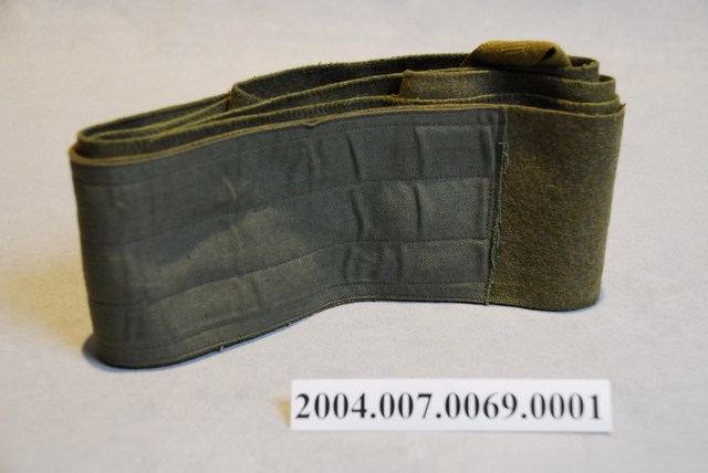 此一綁腿是以草綠色麻布料製成,寬度約9公分,兩邊以鎖邊機(拷克機)鎖邊處理,目的是防止布料毛邊,綁腿的末端以縫紉機車縫成三角形,最尾端再連接棉繩做為綁帶,綁腿布料內層以斜紋棉布車縫固定,並且來回車縫數道壓線以防止變形,並增加布料的堅牢度。
