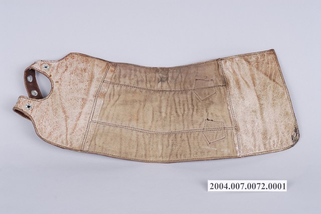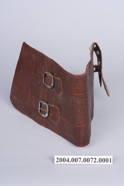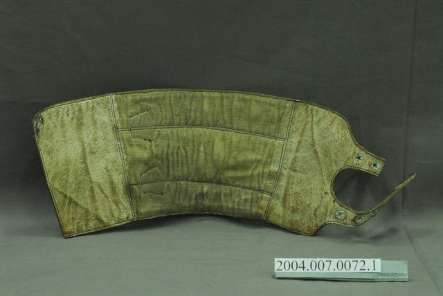 1.本件為雙扣皮綁腿的左件,全牛皮製,呈寬長帶狀,其長度足夠包覆小腿肚,有兩個環扣及穿孔皮帶可固定於靴子上方與小腿肚,通常搭配及踝短靴使用。2.士兵打綁腿可以避免長時間過度運動而產生的腫漲,以及跨越障礙時保護腳部不易受傷,在二戰時期被許多國家視為士兵的標準配備之一。