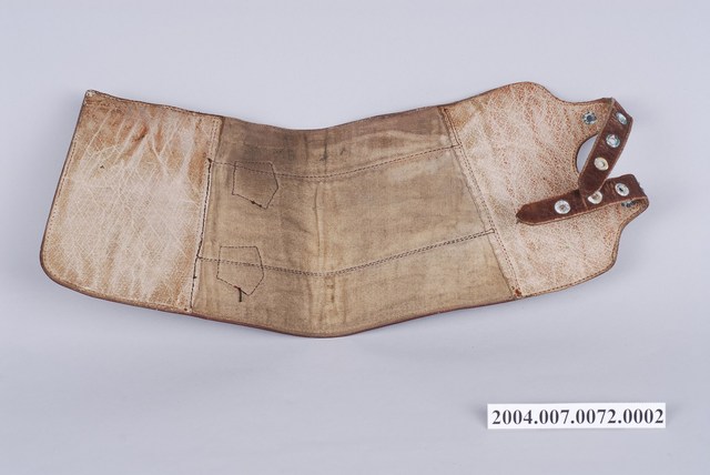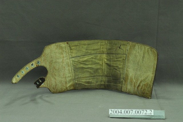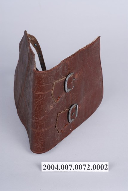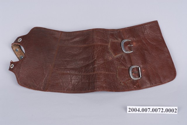 1.本件為雙扣皮綁腿的左件,全牛皮製,呈寬長帶狀,其長度足夠包覆小腿肚,有兩個環扣及穿孔皮帶可固定於靴子上方與小腿肚,通常搭配及踝短靴使用。2.士兵打綁腿可以避免長時間過度運動而產生的腫漲,以及跨越障礙時保護腳部不易受傷,在二戰時期被許多國家視為士兵的標準配備之一。