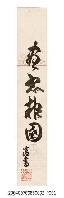 1.本件直式書法盡忠報國請書,「盡」字背後印有紅色花紋圖案,「國」字下方印有紫色富士山圖案,「請書」下方有方形印章「長谷川清」,紙面略呈泛黃,保存完整。2.「請書」是指「確認」的意思。