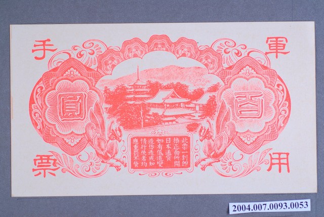 1.本物件是軍用手票1張。軍票正面為棕綠色;外框設計是以「百」字結合花紋圖案,外框底部印有「大日本帝國印刷局製造」字樣;軍票右側是日本古代聖德太子肖像,左側是日本法隆寺夢殿;正面中央印有「大日本帝國政府」、「百圓」、「軍用手票」,上下各印有版別編號「16」,左下側蓋有「大藏大臣」圓印章。軍票背面為紅色;外框4個角落分別為「軍」、「用」、「手」、「票」4字,圖框右側印有「百」字,左側印有「圓」字;框內中央圖案是日本法隆寺建築群,為聖德太子所興建;下方註記文字「此票一到即換正面所開日本通貨如有偽造變造仿造或知情行使者均應重罰不貸」。