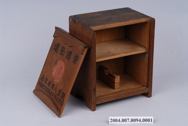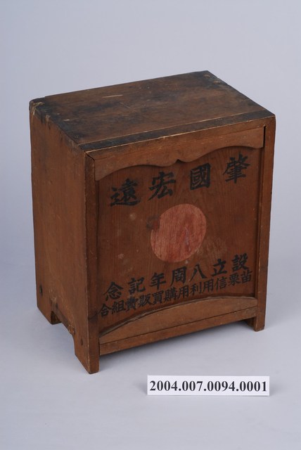 此物件為木製外箱,前蓋刻有「肇國宏遠」、「設立八週年紀念」、「苗栗信用利用購買販賣組合」等字樣,並以象徵旭日的紅色圓圈置中。 此物件為日本的國旗旗幟組,旗幟圖案為一象徵太陽的實心紅圈,置於白底旗幟正中央,其源由來自於日本神話。在日本的神話之中,認為男神伊邪那歧命(いさなき の みこと)與其妹女神伊邪那美命(いさなみ の みこと)結為夫妻後,生下日本本島與列嶼並生下諸神,其中被賦予統治日本的權力的為其第一子:日神-天照大神(現今大多認定其為女性),因此日本為太陽所統治的國家,國旗自然也與太陽相關。此旗於19世紀幕府末年為商船所用,名為「日之丸」,後由日本海軍所沿用作為海軍旗,二戰結束過後,對於是否將「日之丸」定為國旗產生爭議,但最後在1999年日本政府立法將「日之丸」確定為日本國旗。 發行此物件的苗栗信用利用組合,為日治時期臺灣苗栗地區的金融機構。日治的金融機構主要分成兩種,為「銀行」以及「信用利用」。「銀行」主要為資本家提供儲蓄以及融資,且主要由日本人掌管。而「信用利用」為基層金融機構,主要為農村提供融資、整理農家的負債並增進農家福利,主要以農家與中小型工商業者為融資對象,主要由地主所掌控,前身為地主把持的高利貸的金融機構「土塹間」,日本政府藉此設施掌握地方經濟、宗教勢力;拉攏農民、地主。