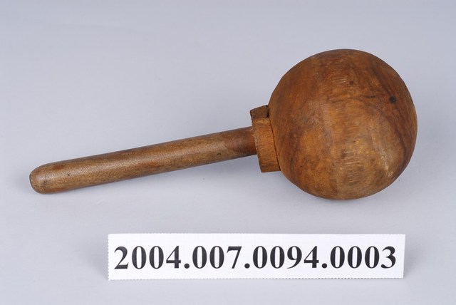 此物件為國旗之旗頭附件,為木製品,頂端為球形體。 此物件為日本的國旗旗幟組,旗幟圖案為一象徵太陽的實心紅圈,置於白底旗幟正中央,其源由來自於日本神話。在日本的神話之中,認為男神伊邪那歧命(いさなき の みこと)與其妹女神伊邪那美命(いさなみ の みこと)結為夫妻後,生下日本本島與列嶼並生下諸神,其中被賦予統治日本的權力的為其第一子:日神-天照大神(現今大多認定其為女性),因此日本為太陽所統治的國家,國旗自然也與太陽相關。此旗於19世紀幕府末年為商船所用,名為「日之丸」,後由日本海軍所沿用作為海軍旗,二戰結束過後,對於是否將「日之丸」定為國旗產生爭議,但最後在1999年日本政府立法將「日之丸」確定為日本國旗。 發行此物件的苗栗信用利用組合,為日治時期臺灣苗栗地區的金融機構。日治的金融機構主要分成兩種,為「銀行」以及「信用利用」。「銀行」主要為資本家提供儲蓄以及融資,且主要由日本人掌管。而「信用利用」為基層金融機構,主要為農村提供融資、整理農家的負債並增進農家福利,主要以農家與中小型工商業者為融資對象,主要由地主所掌控,前身為地主把持的高利貸的金融機構「土塹間」,日本政府藉此設施掌握地方經濟、宗教勢力;拉攏農民、地主。