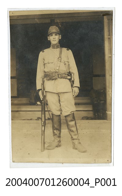 本物件為臺灣子弟從軍照,為黑白照片,為1名著軍服戴軍帽之臺灣男子,右手拿長槍豎立於地。