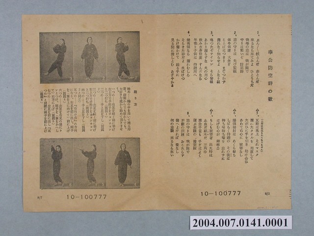 1. 本件為皇民奉公會所制定發行的〈奉公防空群之歌〉以及〈快樂的奉公班〉的舞蹈教學講解文宣,本件為第3、4、5、6頁,文宣為黑白印刷,以文字以及舞蹈動作照片解說,用以作為教學之用。2. 皇民奉公會,簡稱皇奉。是臺灣在日本時代末期為配合「新體制運動」,而於昭和16年(1941年)所成立的組織。在「臺灣一家」的理念下,進行社會動員,將民間與各階層領導者網羅其中,以達成總督推行的各項目標。奉公會的組織可分為中央本部、地方組織、外圍團體三部分。