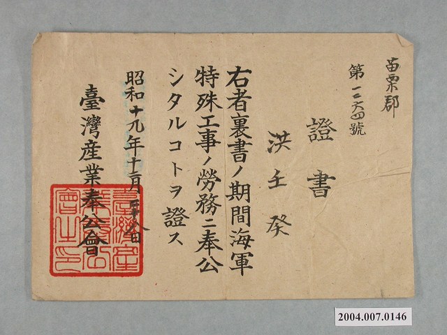 2004.007.0146 昭和19年洪壬癸參與海軍特殊工事證書