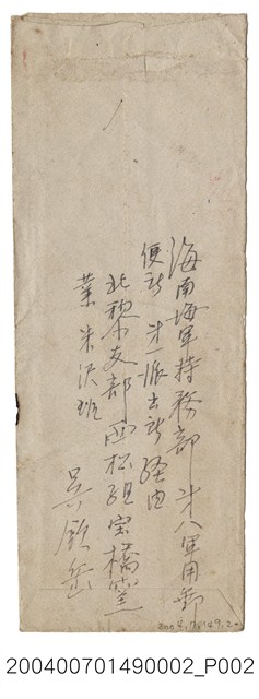 1.大東亞戰爭時期,為數眾多的臺灣人以軍夫、軍屬的名義派遣海外,其中自海南島陷落後,大量臺灣人即被派遣於此,並在日本軍部的鼓勵下,常與島內家屬通信聯絡,本件軍事郵便即為一例。此信封正面可見朱清勳的收信所在地位於「台中州南投郡南投街牛運班四九四」,並有「軍事郵便」、「檢閱濟」等戳章,背面則可得知海南海軍特務部吳清岳所寄。2.海南海軍特務部軍事郵便,本機關成立於昭和14年。且信封套上寫台中州,此一行政區劃為大正9年(1920)始成立,故推測為昭和年間之信。