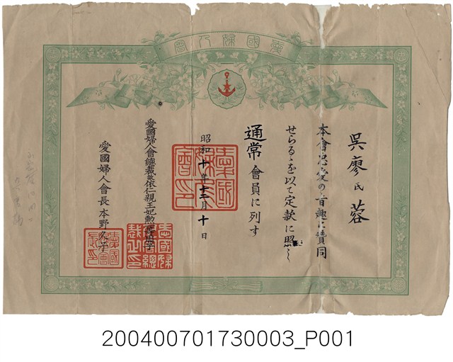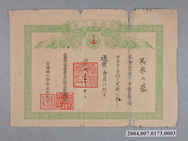 2004.007.0173.0003 吳廖氏蓉愛國婦人會通常會員證書