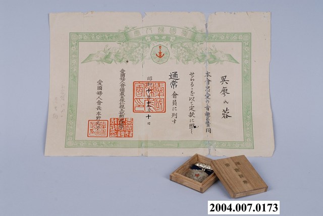 2004.007.0173 吳廖氏蓉愛國婦人會通常會員章及證書