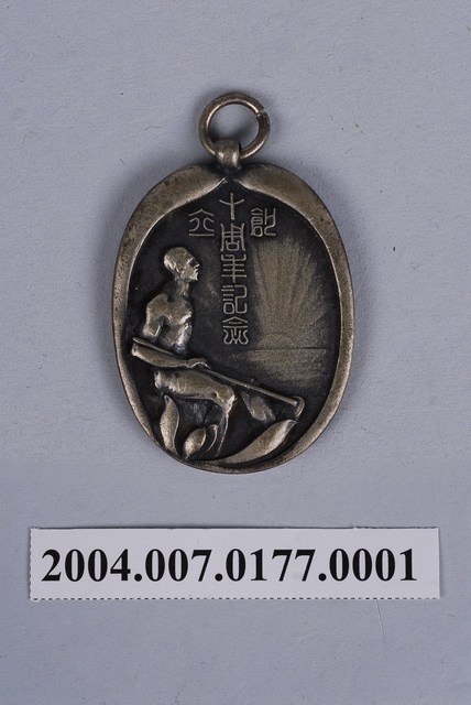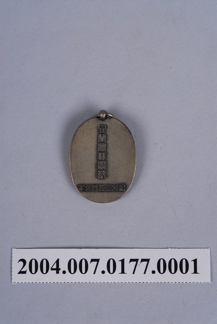 1.本物件為宜蘭農林學校創立十週年紀念徽章,其為金屬材質,正上方有一圓環,而徽章本體為橢圓形狀,中央有「創立十周年記念」字樣,並有一名男子之側臉樣貌以及曙光為背景,徽章背面有字樣「宜蘭農林學校」、「紀元二五九六年」(紀元為日本皇紀)。