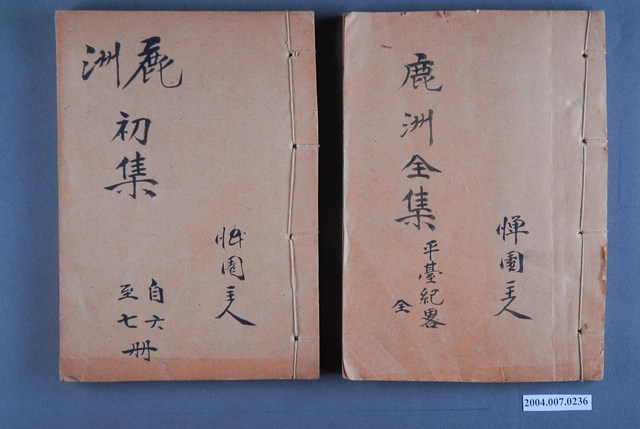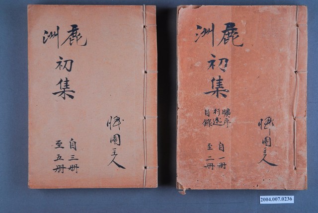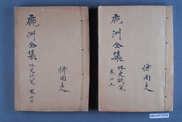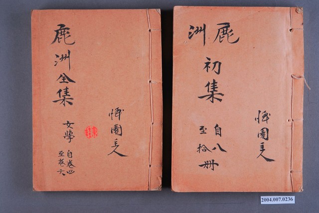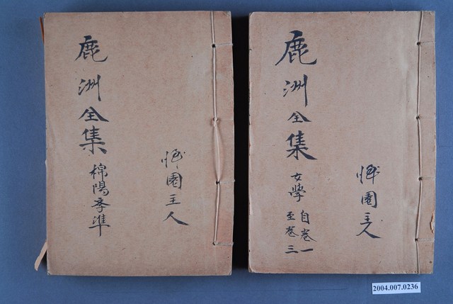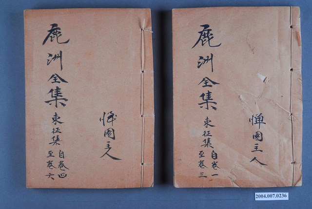 1.本件為《鹿州全集》14冊1組,為線裝書,藍鼎元著作。封面除了書名外,也寫有「憚園主人」等字,外觀呈現泛黃,除幾本書緣略有破損外,大致保存完整。2.藍鼎元(1680~1733),字玉霖,別號任庵,號鹿洲,福建漳浦人。清康熙60年(1721)隨族人藍廷珍渡臺平朱一貴事件,擔任機要秘書。善議論,有卓見,廷珍一切機宜皆其所擬。在臺期間,主張積極開發臺灣,反對閩浙總督對渡臺消極設限之政策。其對臺灣政務之規劃,雖當時未獲採納,卻成為日後清廷治臺之重要參考。《鹿州全集》為蔣炳釗點校之版本。