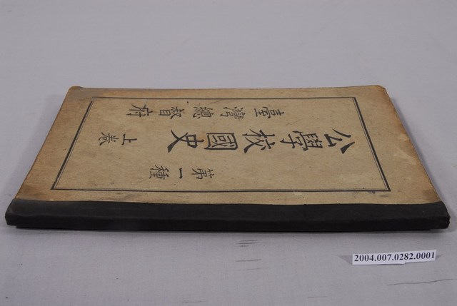 1.本文物為臺灣總督府出版《公學校國史》第一種上卷,大正12年(1923)1月28日初版,本文物為昭和10年(1935)2月10日第13版發行,印刷所:臺北市上奎府町三丁目一番地,江里口商會工場。印刷人為江里口秀一,臺北市本町一丁目十番地。蓋有「臺灣總督府出版學校用拂下圖書 發行之證」章。內容以日本歷史為主,從天照大神、神武天皇至戰國時期等,全書共有28篇與年表1篇。2.明治31年(1898)臺灣總督府發布〈臺灣公學校令〉,將國語、習字、作文、讀書、算數、唱歌、體操列入教學科目,並於大正元年(1912)