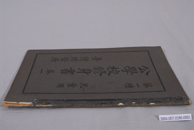 1.本文物為臺灣總督府出版《公學校修身書》卷1,兒童用,昭和3年(1928)2月12日初版,本文物為昭和10(1935)年12月25日第10版發行,印刷所:臺北市上奎府町三丁目一番地,江里口商會工場。印刷人為江里口秀一,臺北市本町一丁目十番地。蓋有「臺灣總督府出版學校用拂下圖書 發行之證」章,以片假名書寫,目錄有24課,內容為守時、天皇陛下、學習、自律與人際關係等。2.明治31年(1898)臺灣總督府發布〈臺灣公學校令〉,將國語、習字、作文、讀書、算數、唱歌、體操列入教學科目,並於大正元年(1912)改