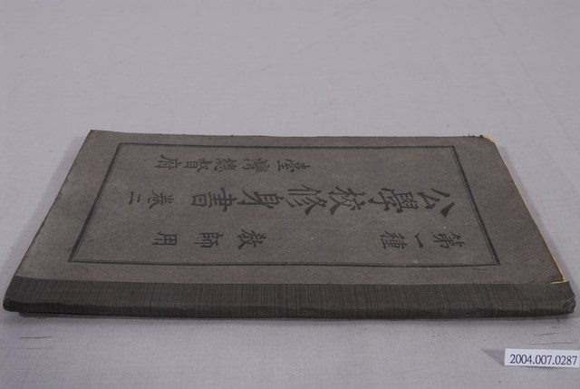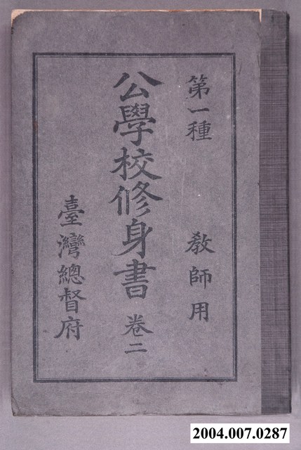 1.本文物為臺灣總督府出版第一種《公學校修身書》卷2,教師用,昭和13年(1938)10月25日第3版發行,印刷所:臺北市京町一丁目四一三番地,小塚本店印刷工場。印刷人為加藤豐吉,臺北市榮町二丁目十二番地。蓋有「臺灣總督府出版學校用拂下圖書 發行之證」章,目錄共225課,為教師用指導手冊。2.明治31年(1898)臺灣總督府發布〈臺灣公學校令〉,將國語、習字、作文、讀書、算數、唱歌、體操列入教學科目,並於大正元年(1912)改正教育方針、強調實業教育,包括語言、史地、科學、數學、歌唱、勞動等。