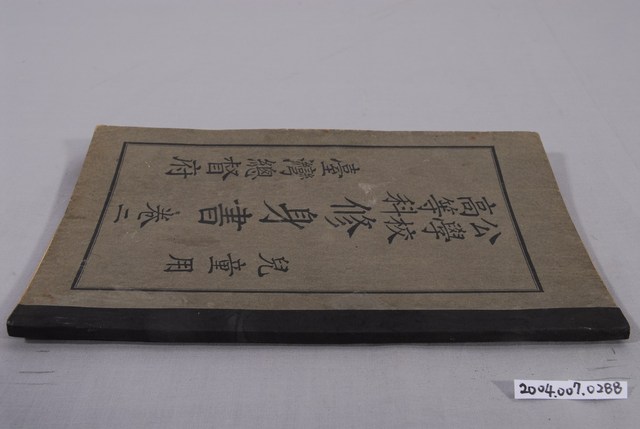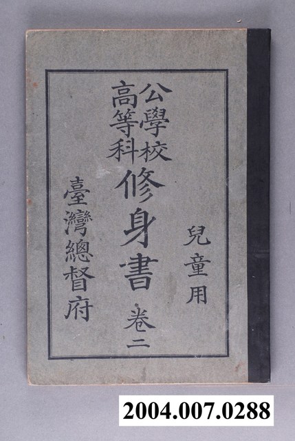 1.本文物為臺灣總督府出版兒童用《公學校高等科修身書》卷2,昭和3年(1928)3月10日第1版發行,本文物為昭和14年(1939)12月20日第8版發行,印刷所:臺北市八甲町一丁目六番地,盛文社。印刷人為青木嵓,臺北市八甲町一丁目六番地。蓋有「臺灣總督府出版學校用拂下圖書 發行之證」章,目錄共26課,主要內容為建國、天皇、國體、忠孝與家庭朋友關係及自身品行修養教育。本書最後一頁有擁有者以鉛筆寫的詩詞〈別水の歌に〉。2.明治31年(1898)臺灣總督府發布〈臺灣公學校令〉,將國語、習字、作文、讀書、算數