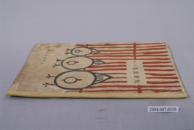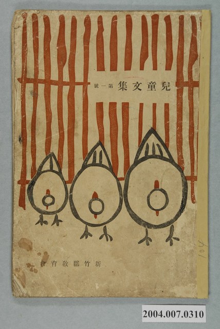 本文物為新竹郡教育會編印《兒童文集 第一號》封面以黑色、紅色畫出3隻小雞的圖樣,色彩單純構圖簡單充滿設計感,可見「兒童文集 第一號」、「新竹郡教育會」字樣。