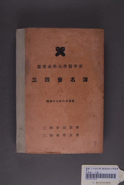 1.本文物為慶應義塾大學醫學部《三四會名簿》,昭和17年(1942)6月調查,昭和17年(1942)10月20日印刷,昭和17年(1942)10月25日發行,編輯兼發行者為三四會同窓會總務部與34會學友會庶務部,東京市四谷區西信濃町二二,慶應義塾大學醫學部。印刷所為鶴屋印刷所,東京市日本橋區本町四之十。目次內容為醫學各科的診療科學教室、研究室、事務室等資訊。2.慶應義塾大學是日本著名思想家福澤諭吉所創建的私立大學,本部在東京都港區。醫學部1917年由初代學部長北里柴3郎設立。1920年於東京信濃町設立附屬醫院。