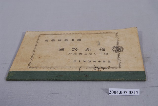 1.本文物為臺中商業學校第16回開校記念《學友名簿》昭和10年(1935)6月1日出版,封面為單色印刷上方有學校標記。本文物封底內署名臺中市後龍子九三吳四川方洋基堅,應為所有人簽名,前一頁則有隨筆塗鴉,內頁內容為通訊錄。2.臺中商業學校為現今「國立臺中科技大學」,大正8年(1919)創校稱「臺灣公立臺中商業學校」,大正10年(1921)改名「臺中州立臺中商業學校」,民國34年(1945)改名為「臺灣省立臺中商業職業學校」,後與臺灣省立臺中補習學校合併,並於民國100年(2011)改名為「國立臺中科技大學」。