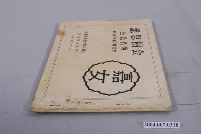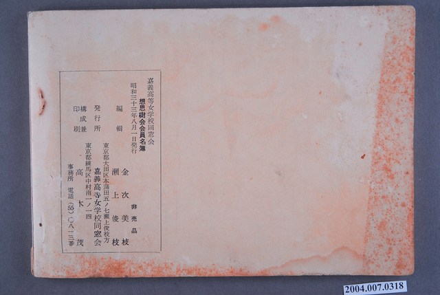1.本文物為嘉義高等女學校同窗會《想思樹會 會員名簿》昭和33年(1958)7月想思樹會本部出版,振替(匯款)東京69122。昭和33年(1958)8月1日發行,編輯為金次美枝、瀨上俊枝,東京都大田區本蒲田五之七,發行所為嘉義高等女學校同窓會,東京都練馬區中村南一之一四,構成兼印刷,高木茂。本文物內容為同窗會之通訊錄及臺灣各地各高中女中同窗會的聯絡資訊,並有包含日本本土各支部會的攝影合照及校歌、想思樹會規約、役員(幹部)訊息、會計報告、寄附者(捐贈捐款者)氏名、後記等內容。2.臺南州立嘉義高等女學校於大正11年(1922)4月創設,時稱臺南州立嘉義高等女學校,民國34年(1945)改名為臺灣省立嘉義女子中學,民國59年(1970)再度更名為國立嘉義女子高級中學。