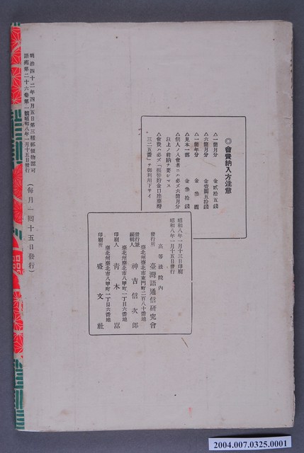1.本書為《語苑》26期1月號,由臺灣語通信研究會於昭和8年(1933)1月13日印刷,1月15日發行,明治42年4月5日第3種郵便物認可,每月15日發行。本書書背處另有黏膠帶加固。2.《語苑》是日治時期臺灣的一份雜誌,1908年4月創刊,主要給警務人員學習臺灣語言的雜誌,《語苑》的內容包括以臺語與日語或是漢文對照的各行業相關對話與短文、對臺語的研究與討論,或是西洋與傳統民間故事的臺語版本,以及對於當時語文問題的探討等等。3. 雜誌的發行兼編輯者是當時總督府高等法院所設立的台灣語通信研究會,參與者主要是當時的法院通譯。
