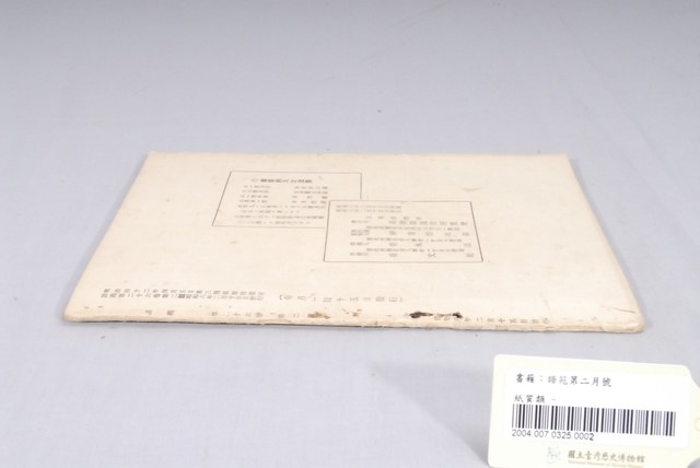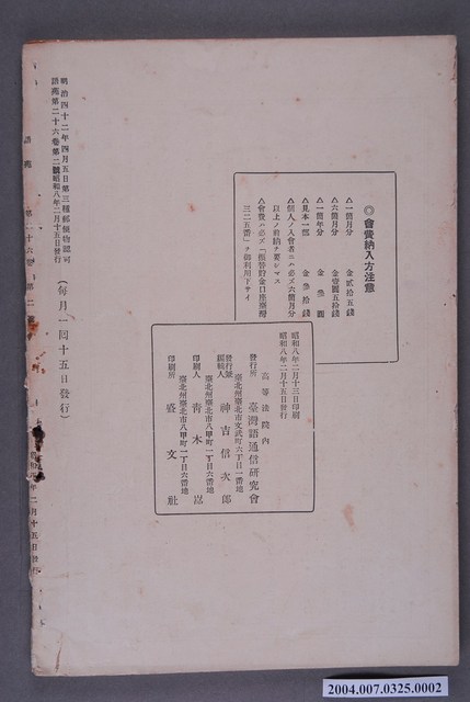 1.本書為《語苑》26期2月號,由臺灣語通信研究會於昭和8年(1933)2月13日印刷,2月15日發行,明治42年4月5日第3種郵便物認可,每月15日發行。本書書背處破損。2.《語苑》是日治時期臺灣的一份雜誌,1908年4月創刊,主要給警務人員學習臺灣語言的雜誌,《語苑》的內容包括以臺語與日語或是漢文對照的各行業相關對話與短文、對臺語的研究與討論,或是西洋與傳統民間故事的臺語版本,以及對於當時語文問題的探討等等。3. 雜誌的發行兼編輯者是當時總督府高等法院所設立的台灣語通信研究會,參與者主要是當時的法院通譯。