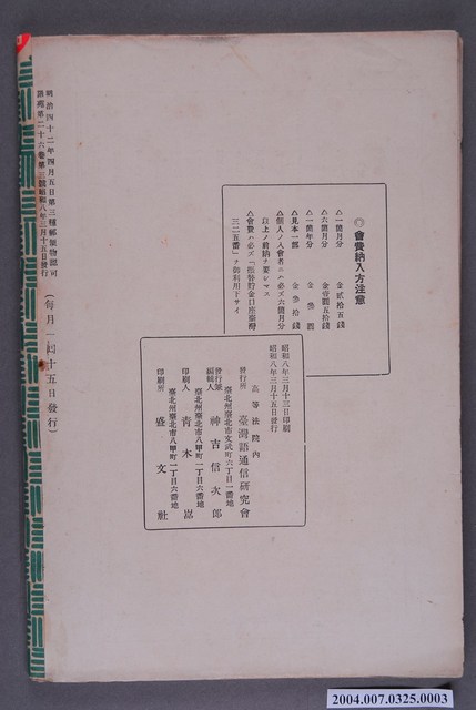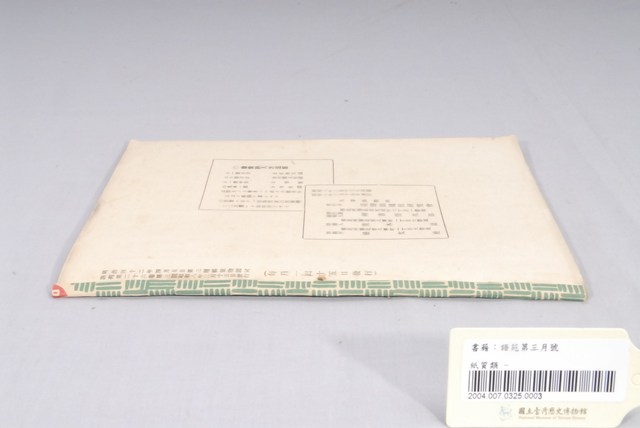 1.本書為《語苑》26期3月號,由臺灣語通信研究會於昭和8年(1933)3月13日印刷,3月15日發行,明治42年4月5日第3種郵便物認可,每月15日發行。本書書背處另有黏膠帶加固。2.《語苑》是日治時期臺灣的一份雜誌,1908年4月創刊,主要給警務人員學習臺灣語言的雜誌,《語苑》的內容包括以臺語與日語或是漢文對照的各行業相關對話與短文、對臺語的研究與討論,或是西洋與傳統民間故事的臺語版本,以及對於當時語文問題的探討等等。3. 雜誌的發行兼編輯者是當時總督府高等法院所設立的台灣語通信研究會,參與者主要是當時的法院通譯。