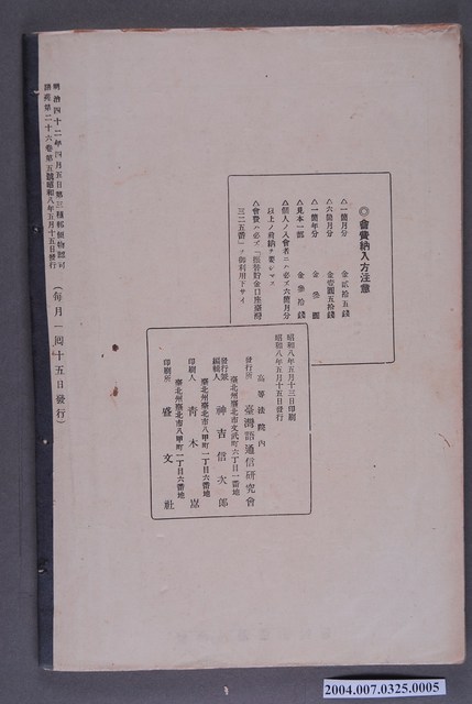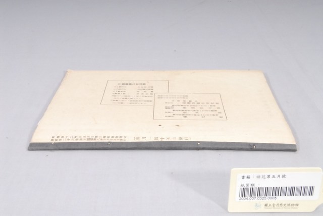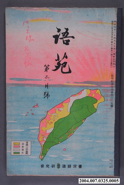 1.本書為《語苑》26期5月號,由臺灣語通信研究會於昭和8年(1933)5月13日印刷,5月15日發行,明治42年4月5日第3種郵便物認可,每月15日發行。本書書背處另有黏膠帶加固,封面有簽名塗鴉痕跡。2.《語苑》是日治時期臺灣的一份雜誌,1908年4月創刊,主要給警務人員學習臺灣語言的雜誌,《語苑》的內容包括以臺語與日語或是漢文對照的各行業相關對話與短文、對臺語的研究與討論,或是西洋與傳統民間故事的臺語版本,以及對於當時語文問題的探討等等。3. 雜誌的發行兼編輯者是當時總督府高等法院所設立的台灣語通信研究會,參與者主要是當時的法院通譯。