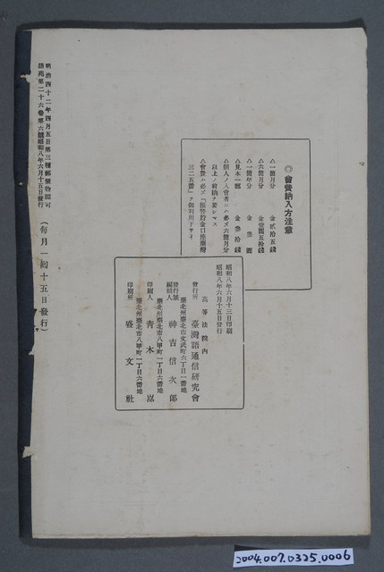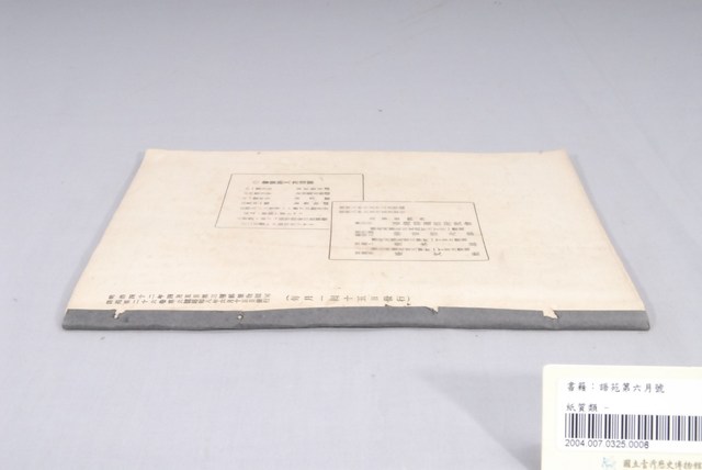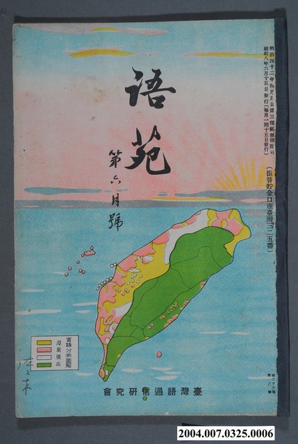1.本書為《語苑》26期6月號,由臺灣語通信研究會於昭和8年(1933)6月13日印刷,6月15日發行,明治42年4月5日第3種郵便物認可,每月15日發行。本書書背處另有黏膠帶加固。2.《語苑》是日治時期臺灣的一份雜誌,1908年4月創刊,主要給警務人員學習臺灣語言的雜誌,《語苑》的內容包括以臺語與日語或是漢文對照的各行業相關對話與短文、對臺語的研究與討論,或是西洋與傳統民間故事的臺語版本,以及對於當時語文問題的探討等等。3. 雜誌的發行兼編輯者是當時總督府高等法院所設立的台灣語通信研究會,參與者主要是當時的法院通譯。