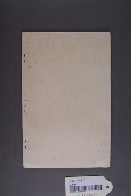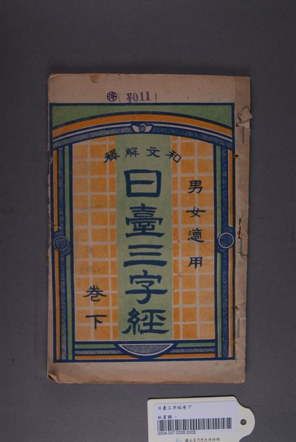 本文物的封面文字:和文解釋《日臺三字經》男女適用、卷下,上方蓋有丸停圓章及¥011,右翻書。原封底應已破損,以雲彩紙重新裝訂。本書為昭和十五年七月三日印刷、昭和十五年七月十五日發行、昭和十五年十二月二十四日再版,定價金弍拾錢,著作兼發行:鍾寶,台中州員林郡員林街員林一七九番地印刷所金木オフセット印刷所(膠印平版印刷),台中州彰化市彰化字西汀二四四番地,印刷人江木。