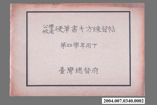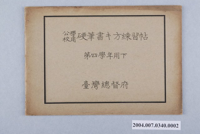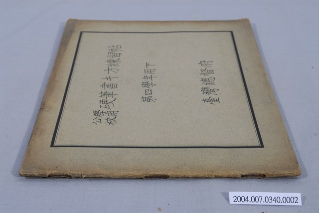 本文物為公學校用《硬筆書キ方練習帖》第四學年用下,書寫示範人為半峰山口彥總,書內每頁有四格,其中兩格空白,兩格有書寫示範。著作兼發行者:台灣總督府,印刷者:藤井松之介,印刷所台灣オフセット(平版印刷)株式會社,昭和六年三月二十八日第一版印刷、昭和六年三月三十一日第一版發行、昭和九年八月十日第四版發行,定價金五錢。