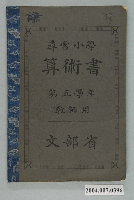 1.本文物為文部省《尋常小學算術書》第5學年教師用,著作兼發行者為文部省,翻刻發行兼印刷者為大阪書籍株式會社。昭和6年(1931)9月8日修正印刷,本書為昭和7年(1932)1月25日翻刻發行。左上角有寫「謙」字,應為所有者署名。2.明治31年(1898)臺灣總督府發布〈臺灣公學校令〉,將國語、習字、作文、讀書、算數、唱歌、體操列入教學科目,並於大正元年(1912)改正教育方針、強調實業教育,包括語言、史地、科學、數學、歌唱、勞動等。