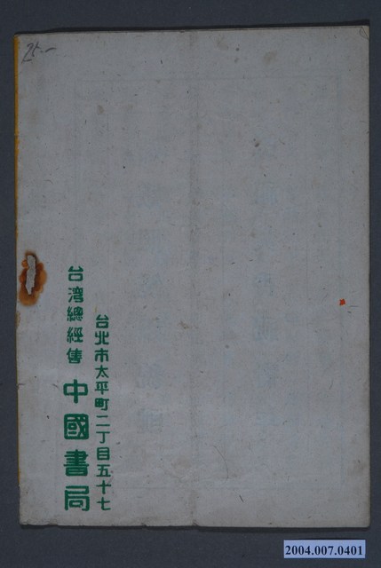 本件為《人生必讀》書籍,封面處印有書名「人生必讀」以及「中國書局印行」字樣,封底處有「台灣總經售中國書局」以及「台北市太平町二丁目五十七」字樣。