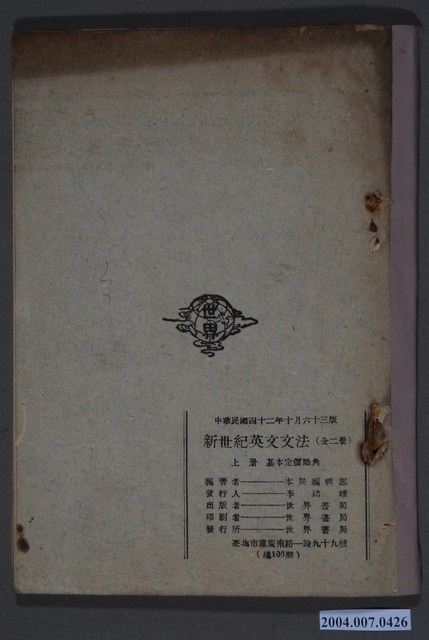 本文物為《新世紀英文文法》上冊("THE NEW EPOCH ENGLISH GRAMMAR" VOLUME ONE),白色書皮。台北世界書局編輯部編著,世界書局發行民國42年10月63版。內容介紹英語各種詞性:名詞、代名詞、形容詞、動詞、變體動詞、副詞、介系詞、連續詞、感嘆詞以及詞類。