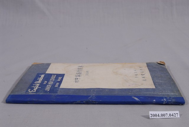本文物為英文作業簿《初中英語作業簿》第五冊,白色書皮,上左下方有藍邊。李兆萱編,臺北復興書局民國43年7月再版印行。背面有「劉俊雄印」私章。內容以英文閱讀測驗練習為主,讓學生回答問題,增進英文閱讀能力。
