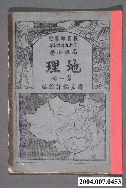 《高級小學地理課本第1冊》,國立編譯館主編,教育部審定,臺灣省政府教育廳發行,環球印刷廠印刷,民國39年4月第3次修訂本,民國41(1952)年8月臺灣版。封面蓋有「臺北縣三峽鎮成福國民學校」(今新北市三城區成福國民小學)紫色戳章。