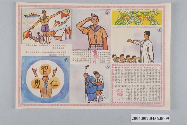 1.本件為「國民小學兒童民族精神教育畫頁之廿一童子軍節畫頁」,保存狀況大致完整,紙張四緣微損,紅框飾以菊花。