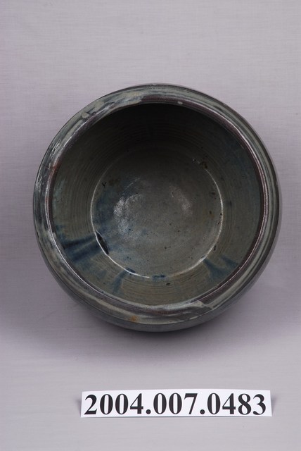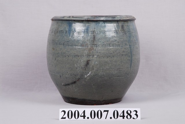 1. 新竹金煉成窯藍釉米罐,廣口,扁尖唇,口部下方略向內凹形成短直頸,圓弧腹,全器最大寬度在腹部下半,向底部略收,器底略向內凹。外器壁上半肩部至腹部下方壓印長方格紋及四排「金煉成」字樣。全器施藍色釉,釉不及底且厚薄不均,口沿及底部呈褐色,外器壁可見一道明顯裂痕,由器口延伸至下腹部。2. 這件陶甕出自新竹的金煉成窯廠,成立於日治大正5年,至民國53年關廠歇業,以豐富的釉彩聞名,產品涵蓋日常生活中各種器具類型。