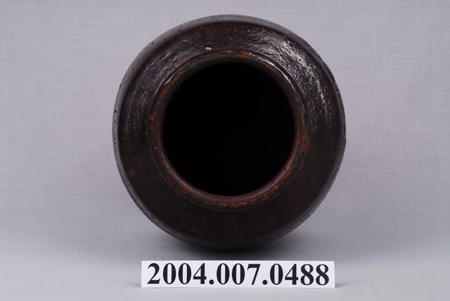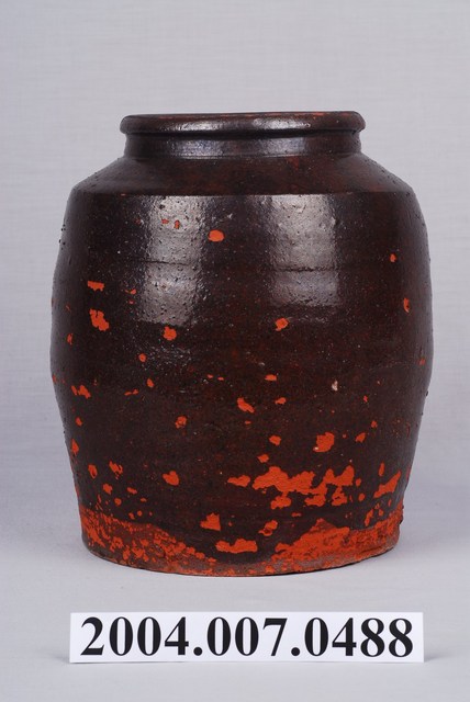 1. 深褐釉豆腐乳罐,廣口,圓唇,短直頸內縮,折肩,器身最寬處在腹部中央,上下略微內收,平底。全器施深褐色釉,釉不及底,厚薄不均,器身和器口上方可見多處磚紅色點狀剝釉。2. 此類陶器亦可稱為「陶罐」,陶罐器形與陶甕相似,形制較小且高度與寬度相近,通常用來呈裝油、鹽、糖等用量較少的日用品,常依其用途來命名,廣口的陶罐也適合用來醃漬醬菜。