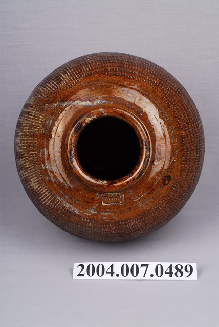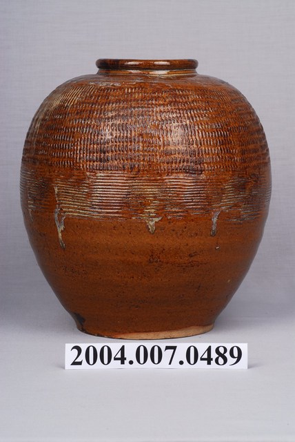 1. 竹南窯業廠褐釉米粒紋鹼菜甕,圓口,圓唇,短頸內縮,肩部弧形寬大,全器最大寬度在腹部中段,向下斜收至底部。外器壁上半肩部至腹部上方壓印米粒紋,腹部中央飾以橫線條紋,器口旁肩部印有「竹南」二字,為竹南窯業廠款識。全器施褐色釉,釉不及底,厚薄不均,部分剝釉。2. 此類陶器亦可稱為「陶罐」,陶罐器形與陶甕相似,形制較小且高度與寬度相近,通常用來呈裝油、鹽、糖等用量較少的日用品,常依其用途來命名。