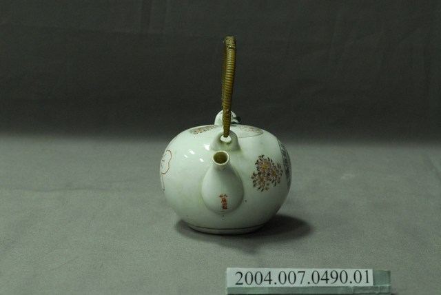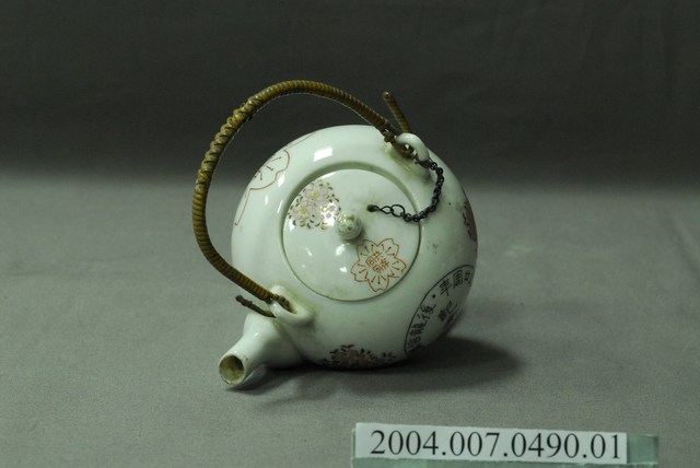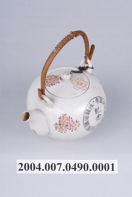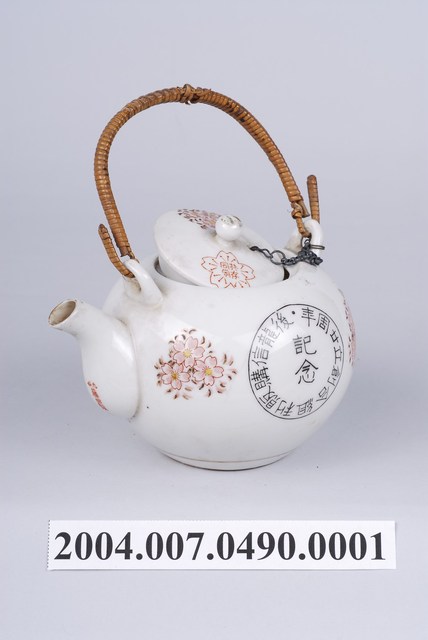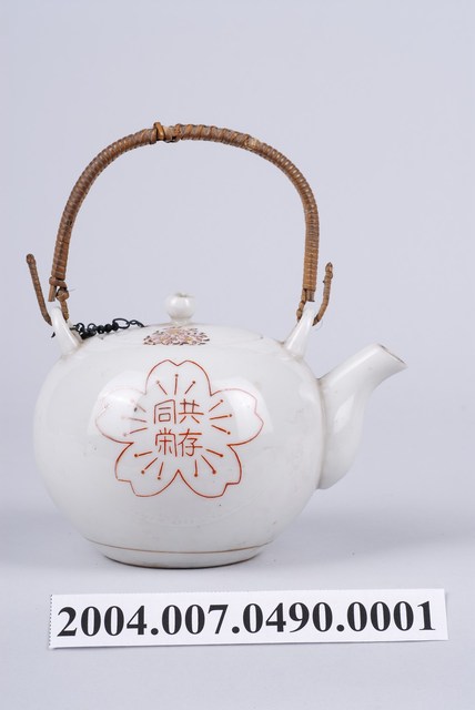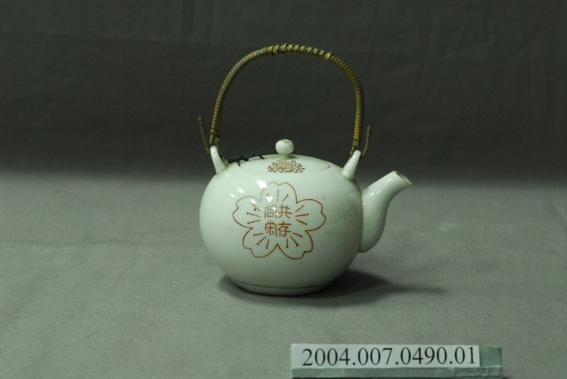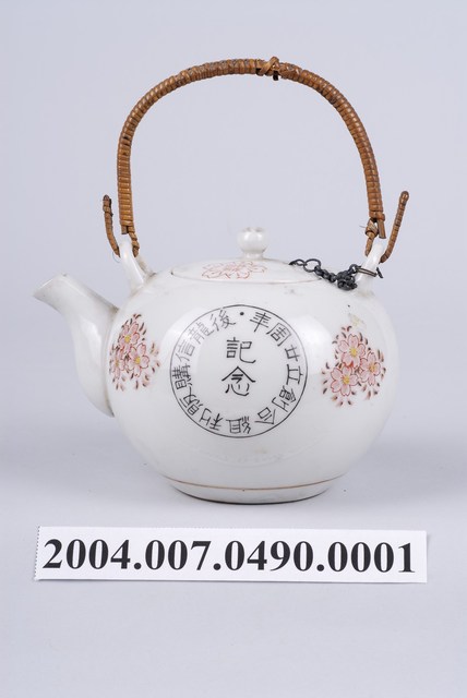 1.本物件是後龍信購販利創立廿周年所製成的紀念茶壺一套,主要有一壺五杯,該組紀念茶壺為白瓷製成,整體圓潤,提把置於上方,為竹編製。壺正面中央有黑釉文字「後龍信購販利組合創立廿周年紀念」,並由圓框框住,圓框兩旁有代表日本的櫻花,壺背面中央為有紅字「共存同榮」,並且框於櫻花圖樣內。壺蓋由鍊子固定於壺身,同樣有紅字「共存同榮」與櫻花花瓣,壺嘴下方有「九谷藤田製」等字樣。此時期臺灣各地信用購買販賣利用組合大多為創立二十周年,為昭和15年(1940),因適逢二戰期間,該紀念茶壺應為日本宣傳大東亞共榮圈為目的而製成。